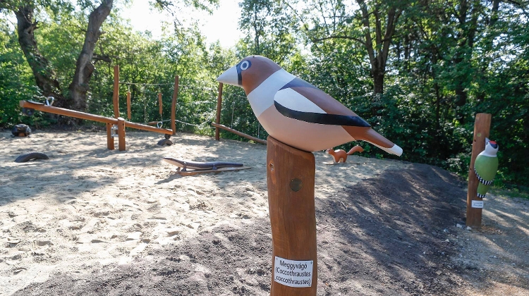 Reaching Csajkó field, which used to be an illegal landfill, a covered rest stop has been set up, with a few wooden toys for kids, shaped like an earth-boring beetle itself, a hawfinch and a European copper skink waiting on the tiny playground.