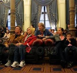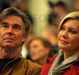 Singer and actress Olivia Newton John, and her husband John Easterling, attend an awards ceremony prior to the start of the annual walk across the historic Chain Bridge in Budapest.